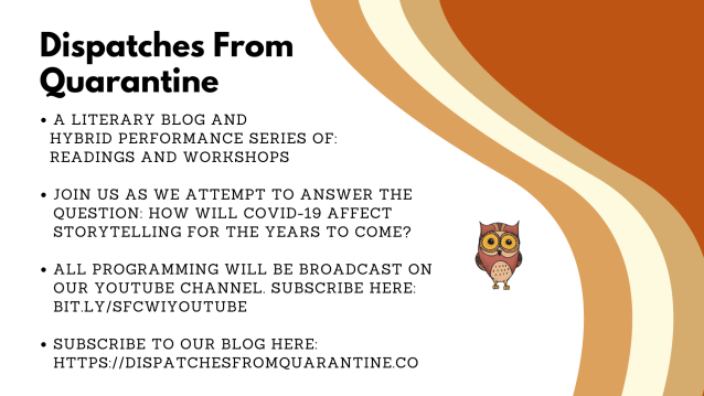 I’m pleased to announce that San Francisco Creative Writing Institute just received a Local Impact Award from the California Arts Council. State funds will support Dispatches from Quarantine: A literary blog turned hybrid performance series of literary events and workshops that attempt to answer the question: How will Covid-19 affect storytelling for the years to come?